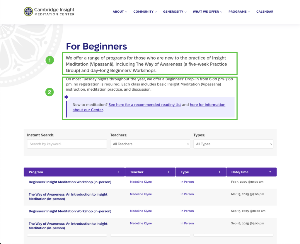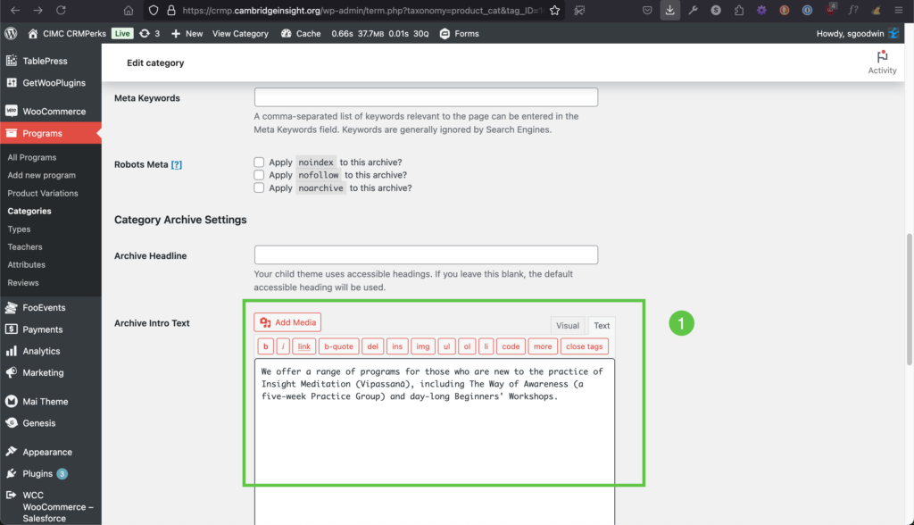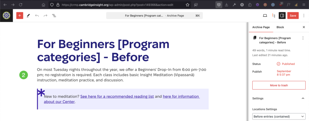 To edit the content that introduces an archive page, you may need to edit the archive description (item 1) or the content before (item 2), or both.