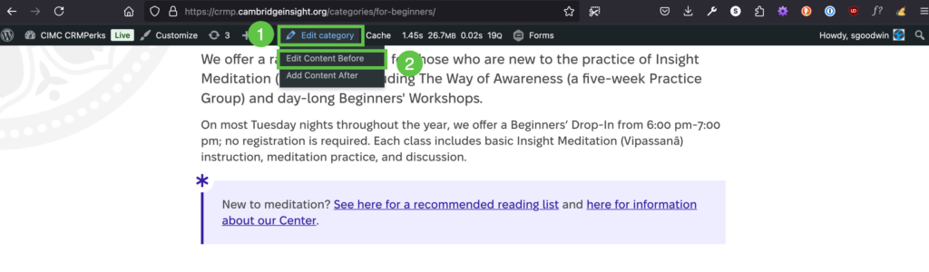 Note the Edit Category link and the Edit Content Before link in the archive edit menu.