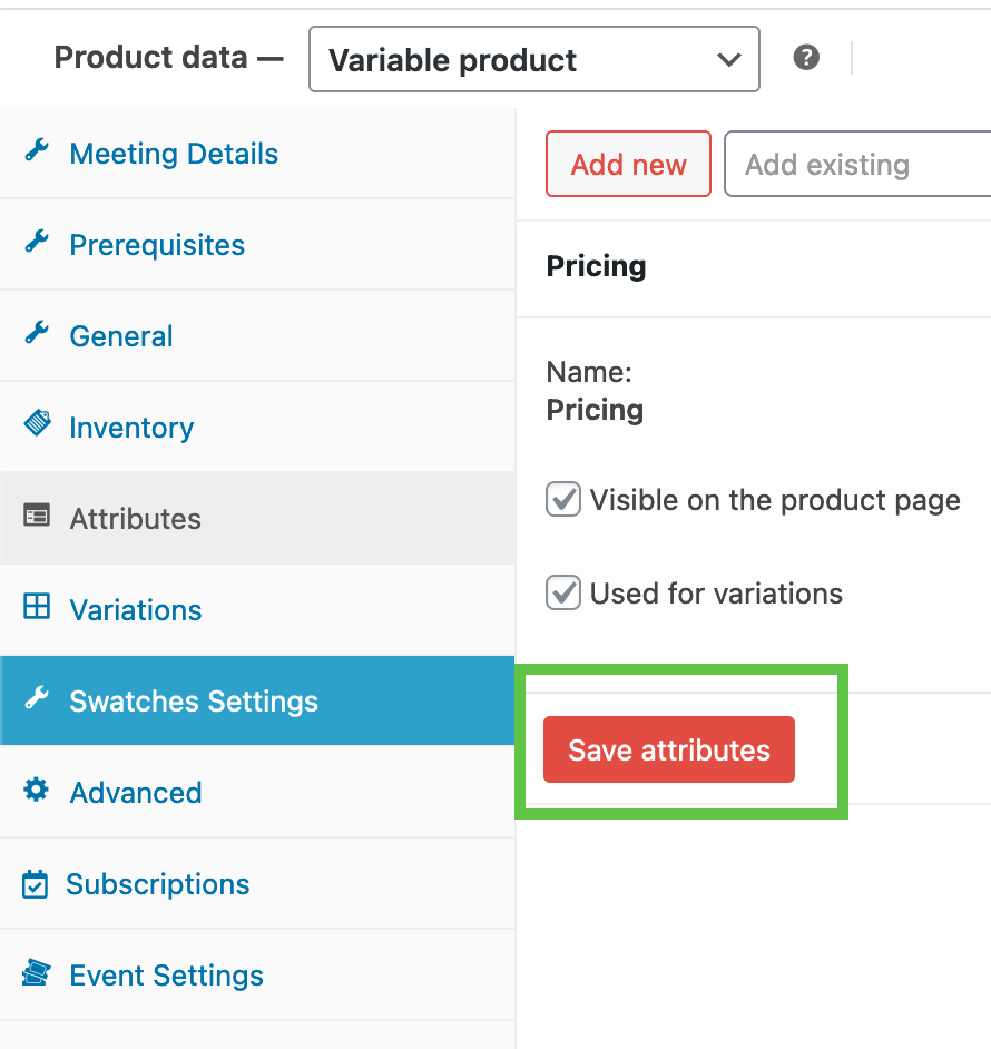 When you’re editing pricing variations and attributes, always be sure to scroll to the bottom of that dialog and save the changes to the product before you save the page. If you forget, none of those attribute changes will be saved.