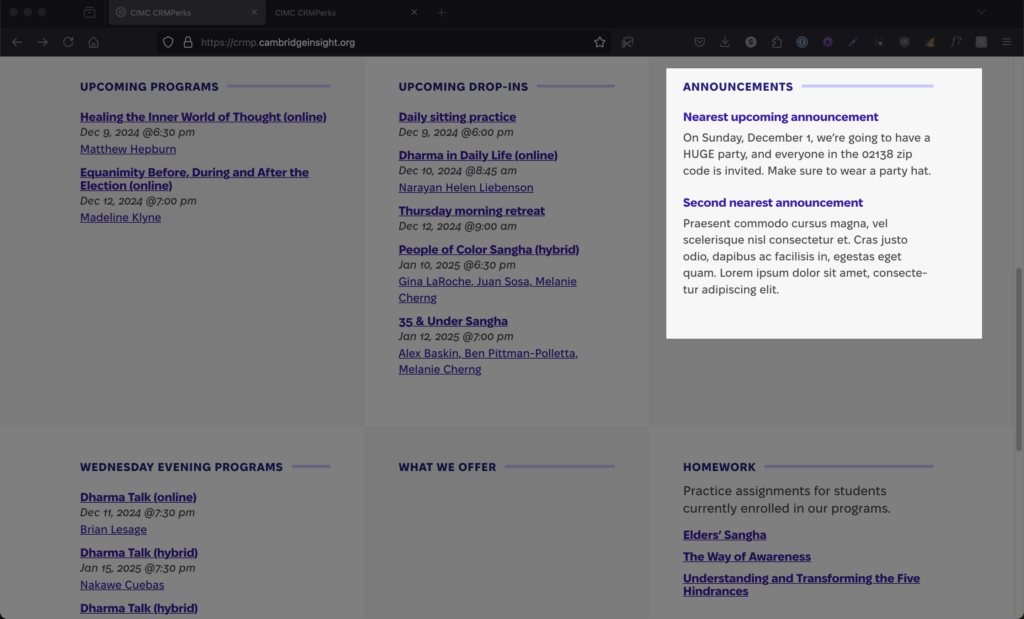 The announcements feature uses the Mai Post Grid to list the posts with category “Announcements.” These are informational posts, not events, so we don’t use the events shortcode.