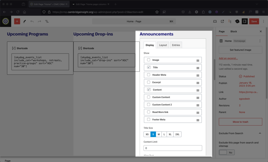 To create an announcement, just create a new post and make its category “Announcements.” Note that the content for these is quite brief, and can contain links just like any other post. I’ve disabled the links to each announcement post itself, since there’s no reason to follow such a link: the entire post is displayed in its column on the home page.