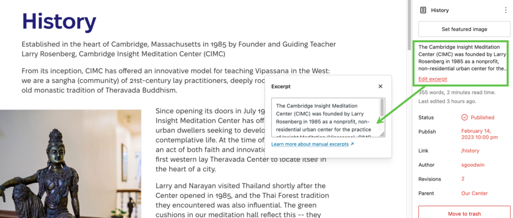 The WordPress theme we’ve built on your new site makes fairly extensive use of page Excerpts. Note that the excerpts dialog is near the top of the right-hand column in the editor.